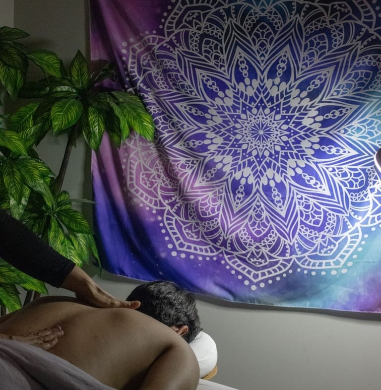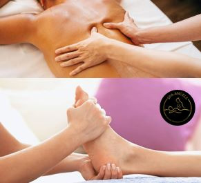 Masaje en pies o espalda, enfocado en cuello, hombros y espalda, zonas donde se acumula el cansancio y estrés cotidiano